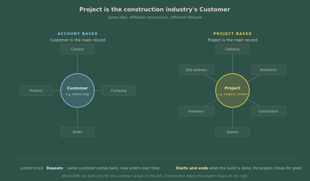 This single difference shapes everything else in this article. Most CRMs are built for account based selling, where the customer comes back. Construction needs a CRM that is built around projects.