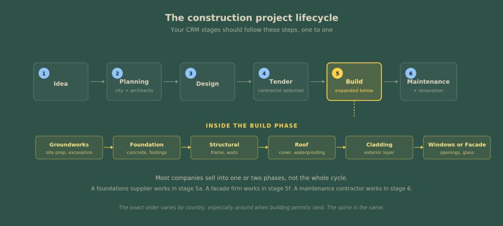 Most companies do not sell across the whole cycle. A foundations supplier works in one phase. A facade firm works in another. A maintenance contractor runs on a different schedule.