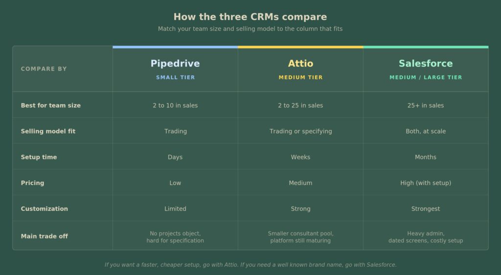 Best for two to twenty five people in sales, especially when specification work is part of the job. You have two options here, Attio and Salesforce. They take different paths to the same outcome.
